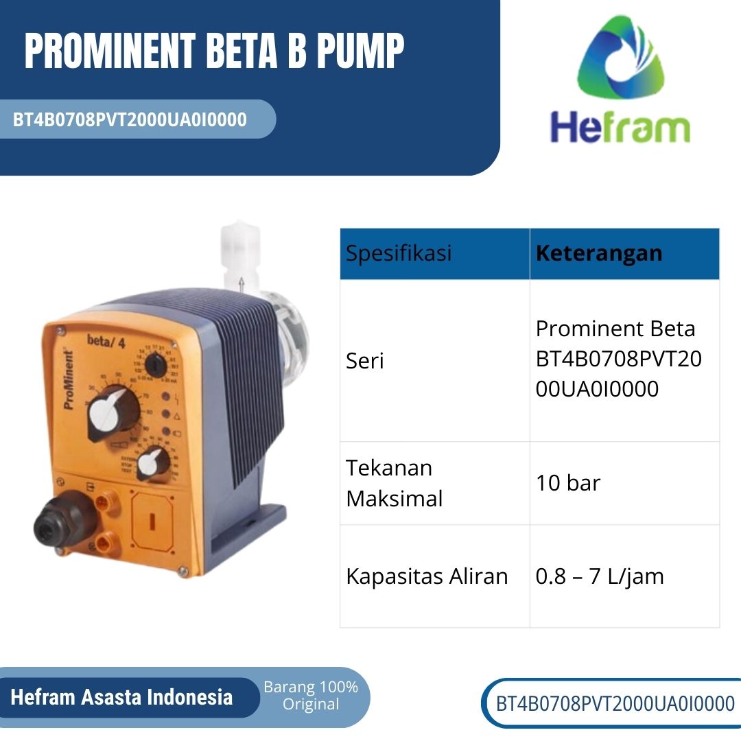 Prominent Beta B Pump adalah solusi dosing pump terbaik untuk kebutuhan industri modern. Dengan spesifikasi unggulan, material premium, dan keunggulan presisi, produk ini memberikan nilai investasi jangka panjang. Jika Anda mencari pompa yang dapat diandalkan, hemat energi, dan aman digunakan, maka BT4B0708PVT2000UA0I0000 adalah pilihan yang tepat.