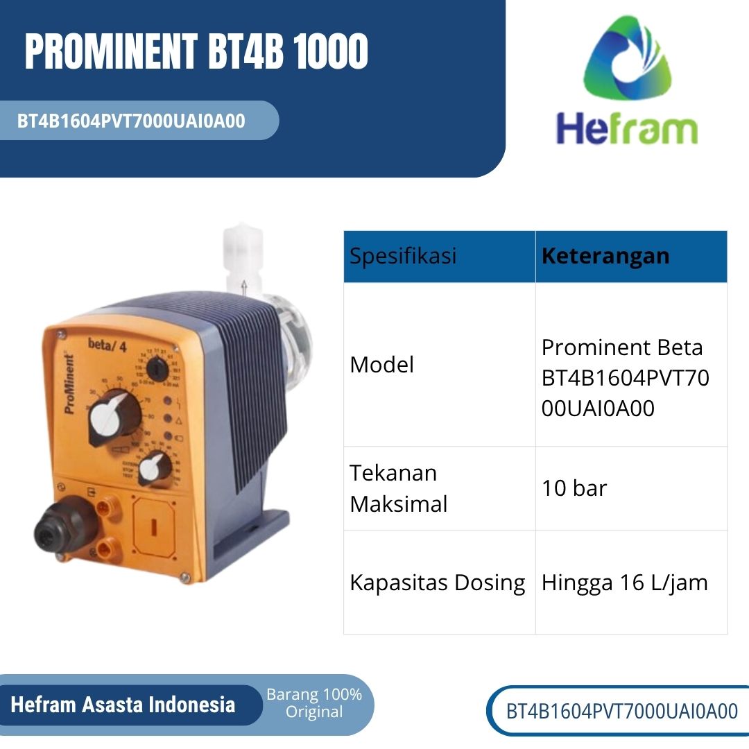 Prominent Beta Series BT4B0708PVT2000UA0I0000 adalah jawaban atas kebutuhan dosing pump modern. Dengan spesifikasi unggul, material premium, serta keunggulan yang mendukung efisiensi dan keamanan, produk ini layak menjadi pilihan utama bagi perusahaan yang ingin meningkatkan kualitas operasional. Investasi pada BT4B 1000 bukan hanya membeli pompa, tetapi membeli kepastian, efisiensi, dan profitabilitas jangka panjang.